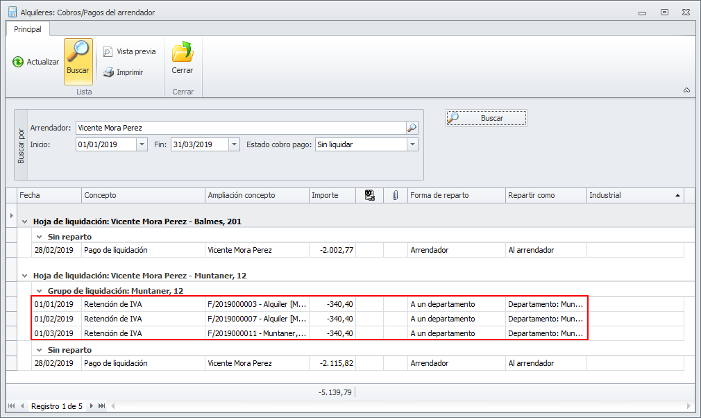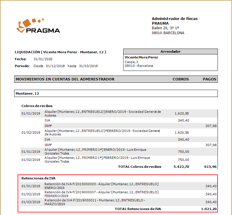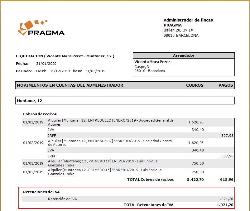 A continuación, puede ver la vista de cobros pagos de un arrendador en la que se muestran las retenciones aplicadas.