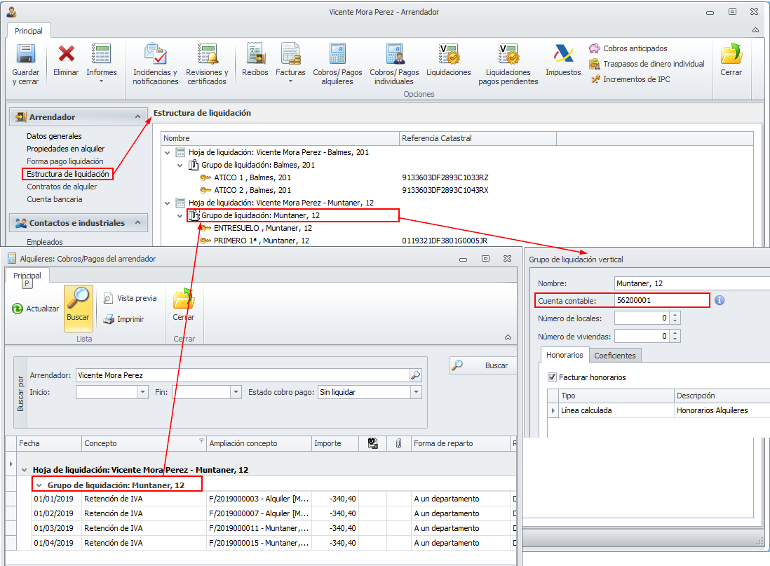 La cuenta para el pago del arrendador se toma del grupo de liquidación al que se encuentra vinculado el recibo. En el siguiente ejemplo, la cuenta deudora es la 56200001.