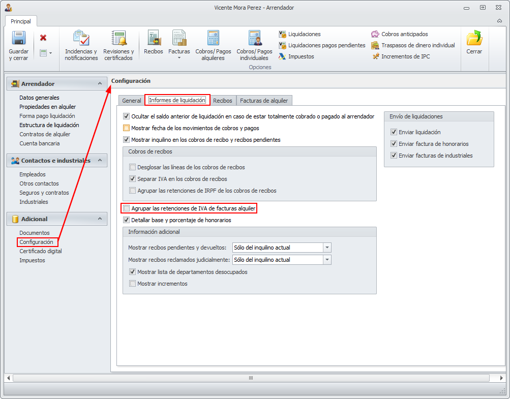 Pueden mostrarse detalladas, factura por factura, o bien agrupadas y sumadas en una sola línea. Este comportamiento se configura en la pestaña Informes de liquidación de la sección Configuración de la ficha del arrendador.