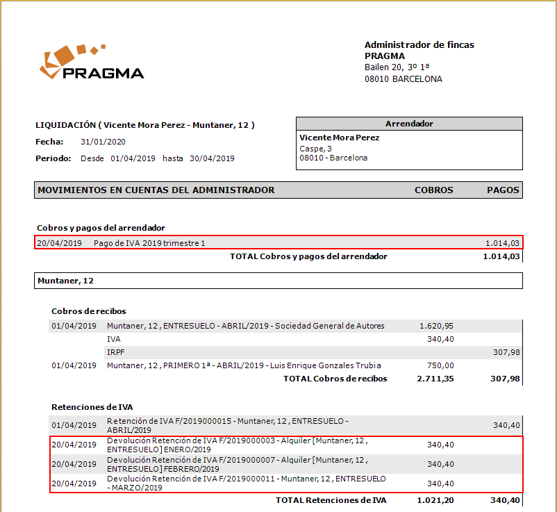 A continuación, puede ver como se refleja en los cobros pagos del arrendador, la devolución del IVA retenido.