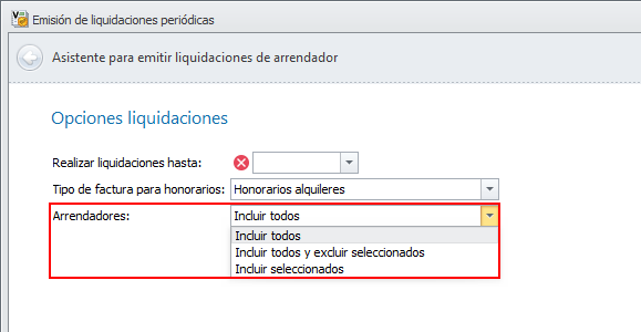 Las opciones Incluir seleccionados e Incluir todos y excluir seleccionados, permiten escoger uno o varios arrendadores, a través de la siguiente ventana.