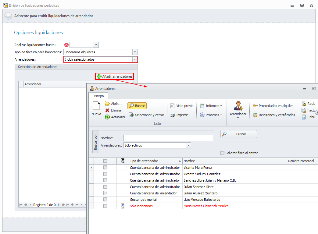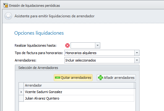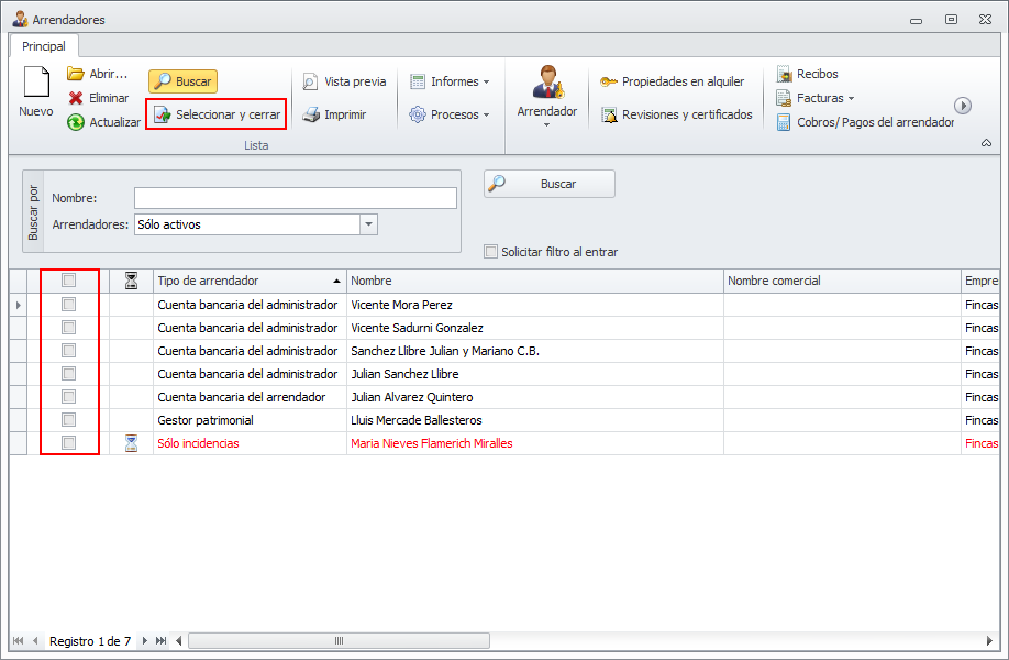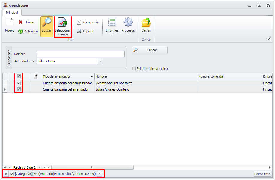 En esta ventana puede seleccionar uno o varios arrendadores y hacer clic en Seleccionar y cerrar.
