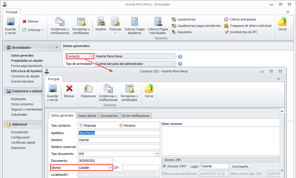 La liquidación del arrendador se confeccionará en el idioma que tenga indicado el arrendador principal en su ficha de contacto.
