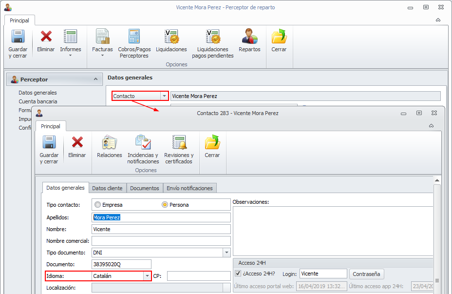 La liquidación del perceptor de reparto se confeccionará en el idioma que tenga indicado en su ficha de contacto.