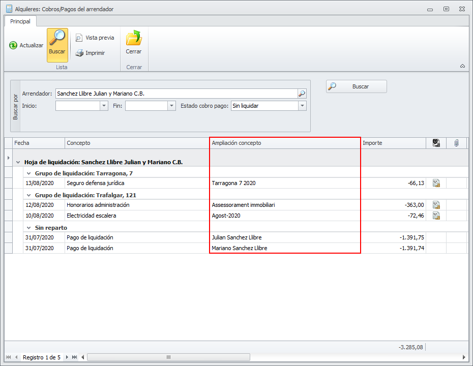 Si a un arrendador le va a confeccionar la liquidación en otro idioma, tenga en cuenta introducir las ampliaciones de concepto en su idioma. Siempre se mostrarán tal y como las haya introducido. Si lo desea, puede corregir estas ampliaciones antes de emitir las liquidaciones, accediendo a la vista de cobros pagos del arrendador.