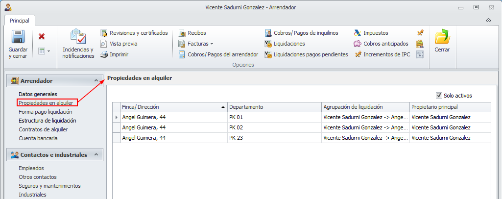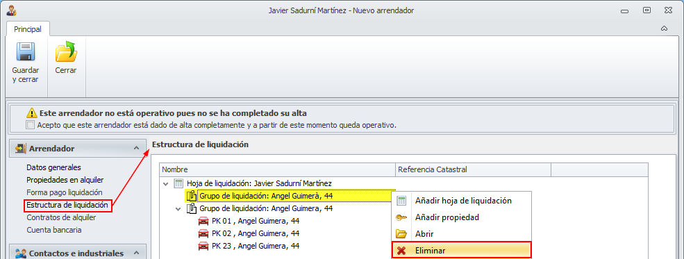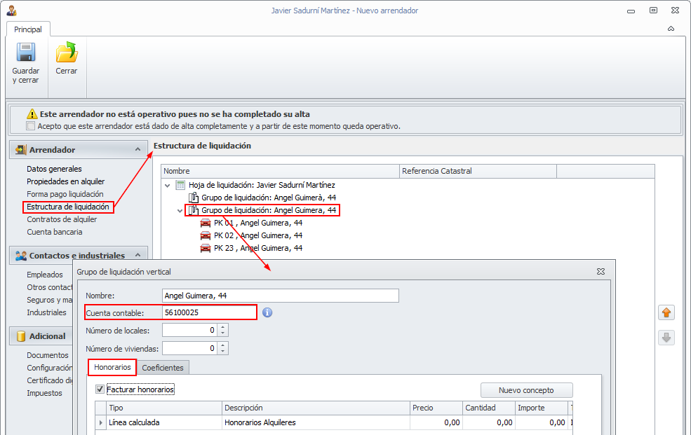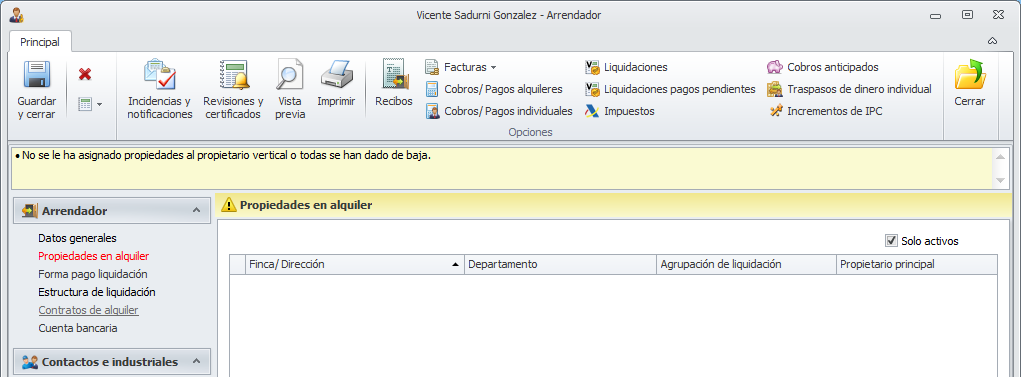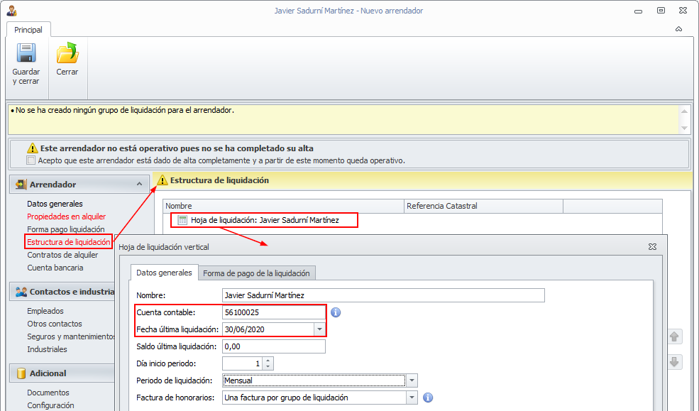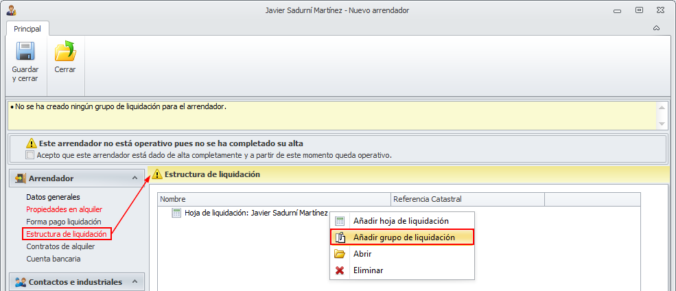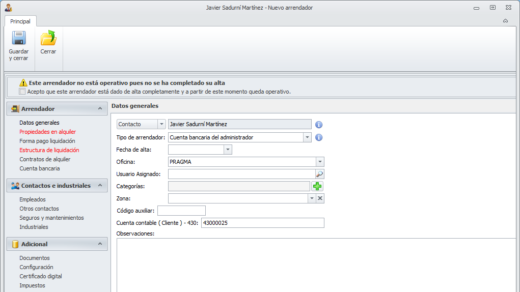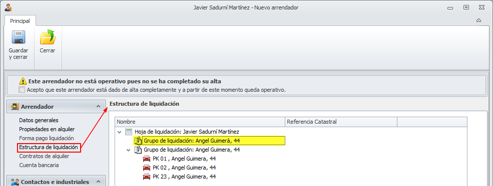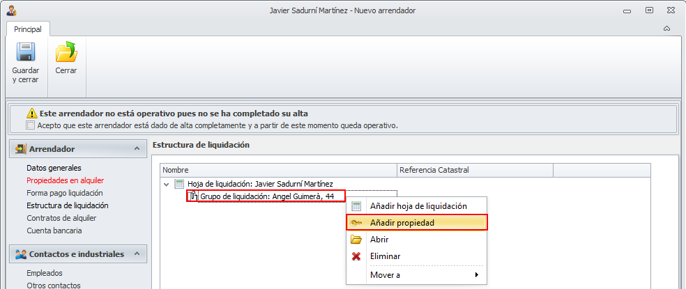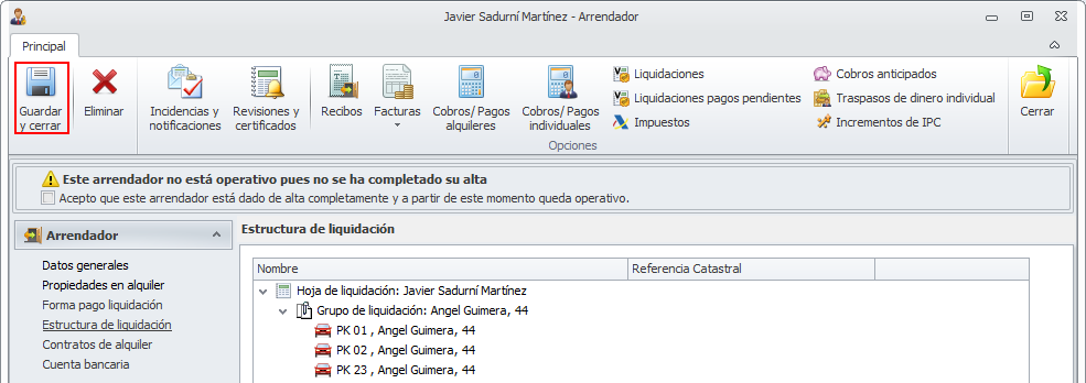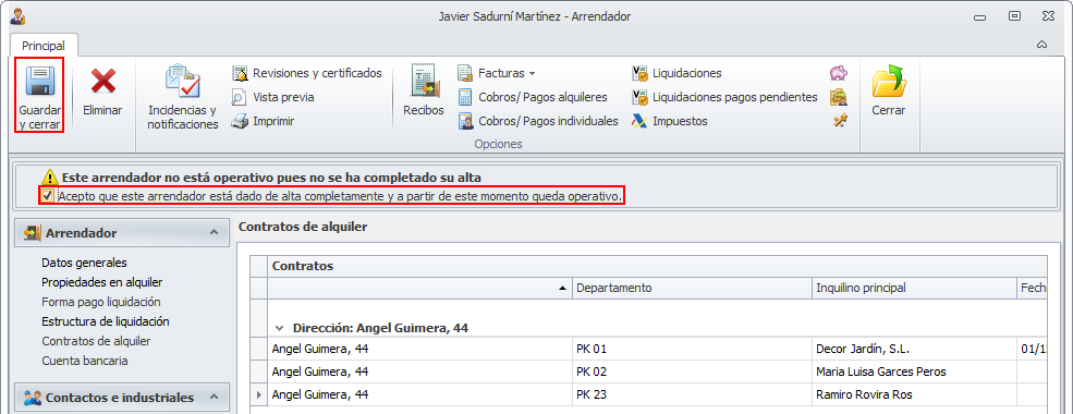 Cuando haya activado todos los contratos de alquiler, marque el arrendador como operativo y guarde su ficha.