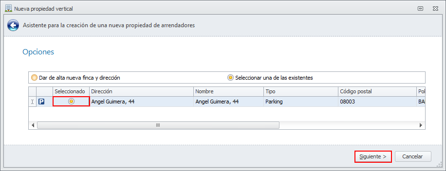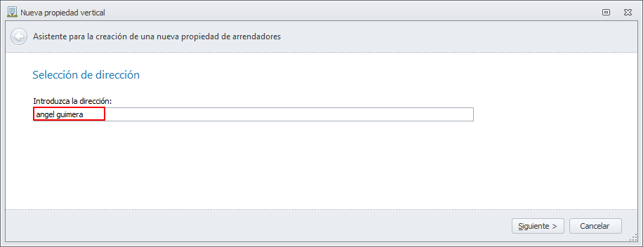 En el asistente de nueva propiedad escriba la dirección de la finca (o parte de ella) y haga clic en siguiente.
