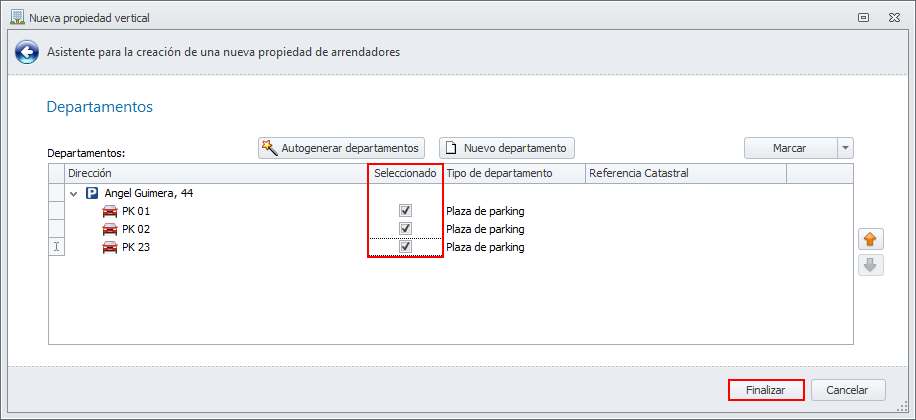 La siguiente ventana del asistente, muestra los departamentos de la finca escogida. Seleccione los departamentos que desea añadir al nuevo arrendador y haga clic en Finalizar.