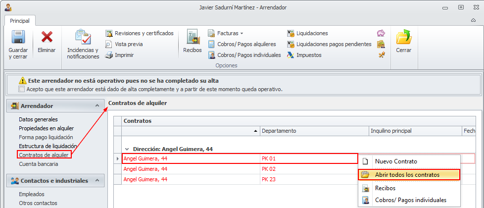 Vuelva a abrir la ficha del arrendador y vaya a la sección Contratos de alquiler. Uno por uno, haga clic derecho sobre ellos y escoja Abrir todos los contratos.
