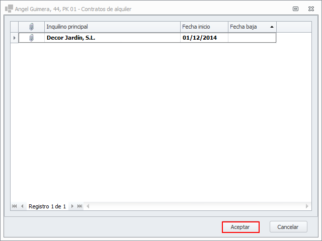 El contrato se mostrará en negrita y sin fecha de baja. Haga clic en Aceptar.