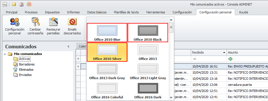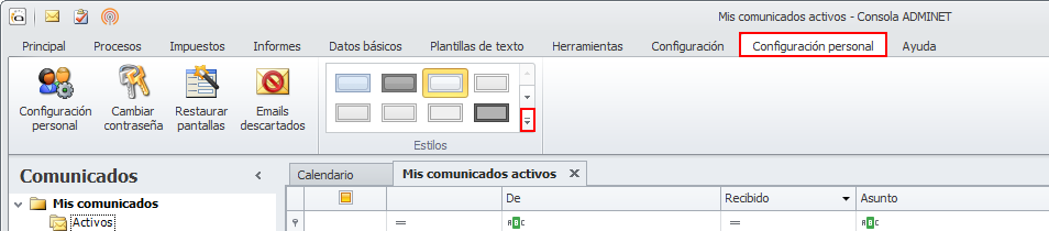 Para facilitarle saber a cual de las dos sesiones de adminet corresponde cada ventana que tenga abierta, lo mejor es asignarle un estilo diferente a cada una de las dos sesiones. En una de ellas vaya a Configuración personal y haga clic en el botón para abrir la lista de estilos.