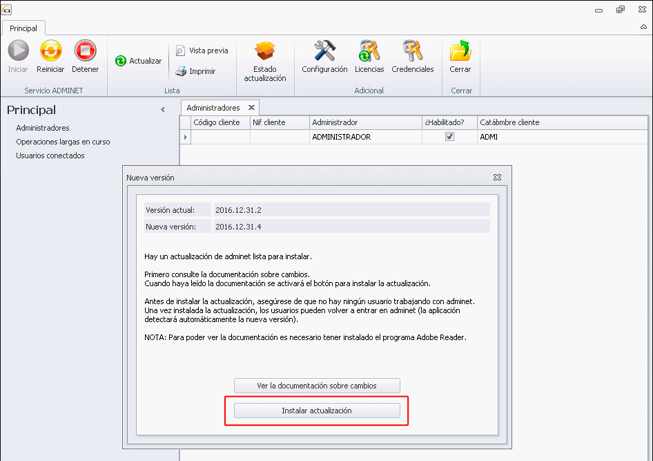 La actualización de adminet Servidor se realiza desde la consola de administración del servidor de adminet.