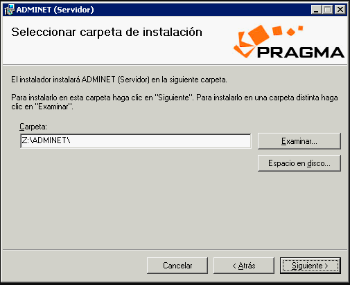 En la siguiente pantalla, el asistente le mostrará la ruta donde se instalará ADMINET. No la cambie bajo ningún concepto. Pulse Siguiente para comenzar la instalación.