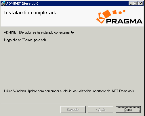 El proceso puede durar unos minutos. No interrumpa nunca el proceso de instalación. Ante cualquier duda o mensaje de error contacte con Pragma.