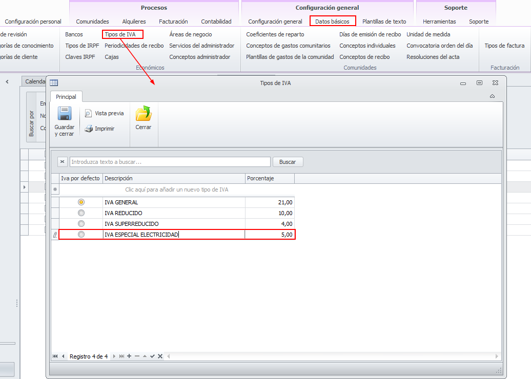 Para añadir un nuevo tipo de IVA, debe acceder al menú Datos básicos y escoger la opción Tipos de IVA.