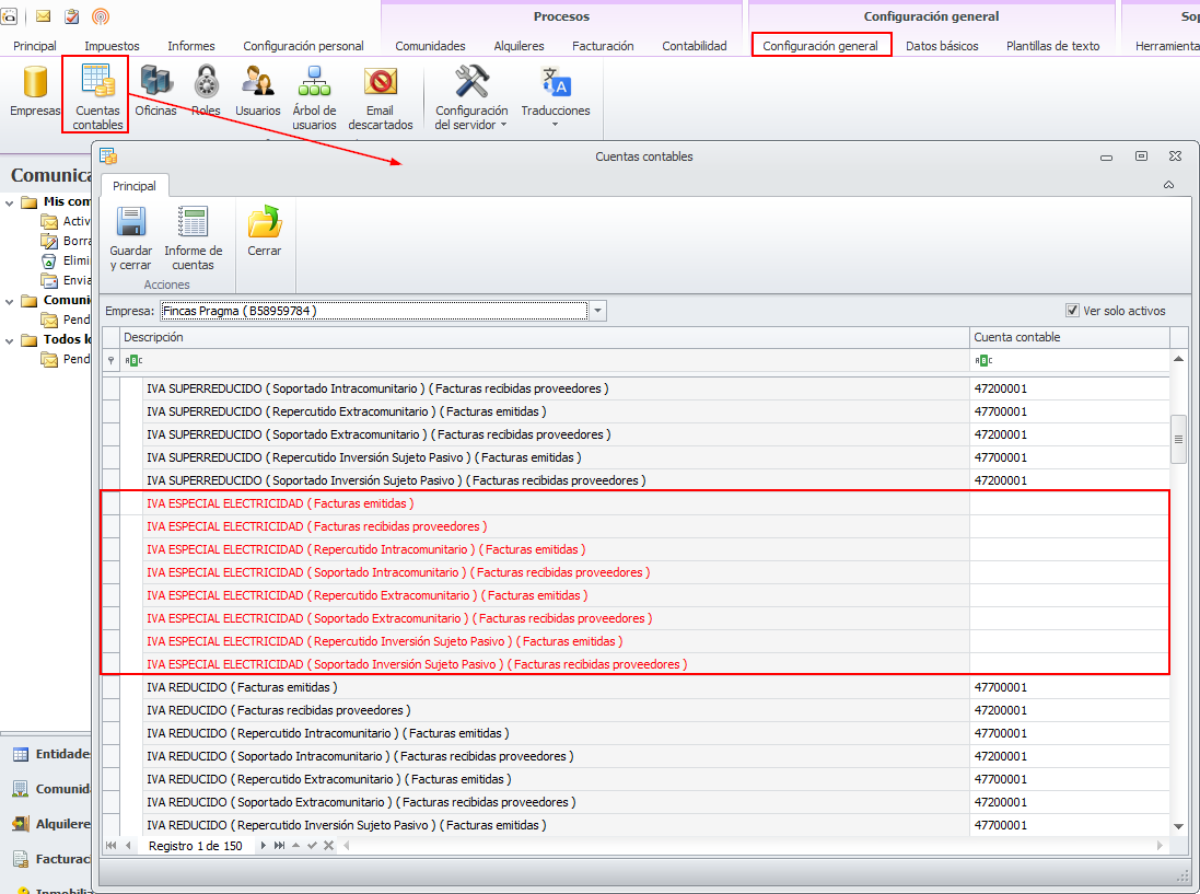 Si tiene activado el enlace contable del administrador, debe también acceder al botón Cuentas contables para asignarles la cuenta contable correspondiente a todas las combinaciones de ese tipo de IVA. Además, deberá tener en cuenta si debe dar de alta o no una nueva cuenta en su programa de contabilidad.