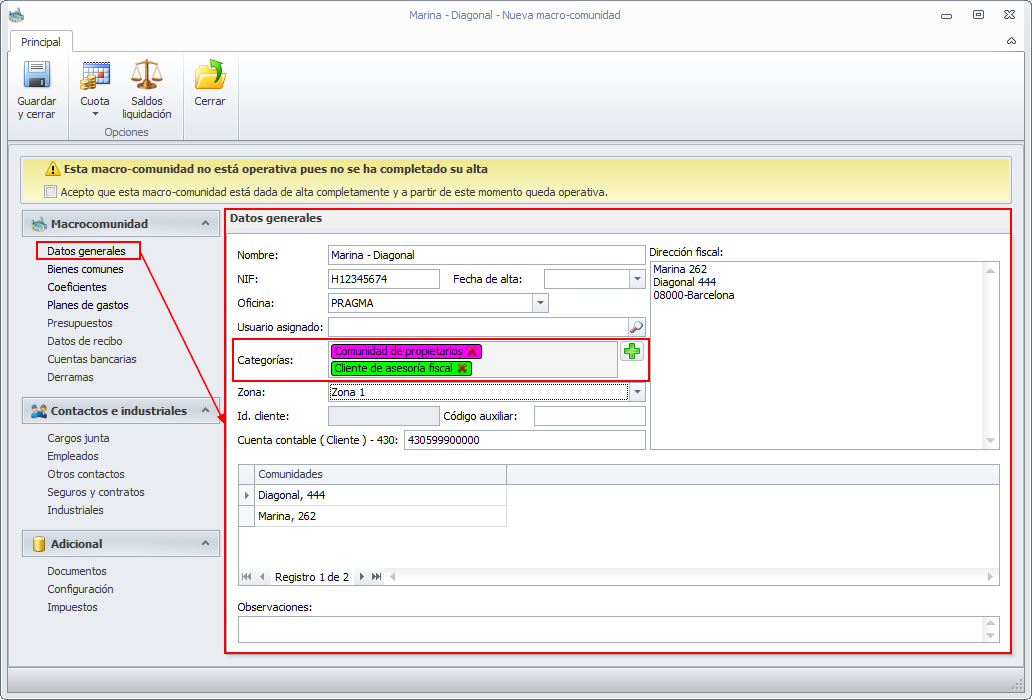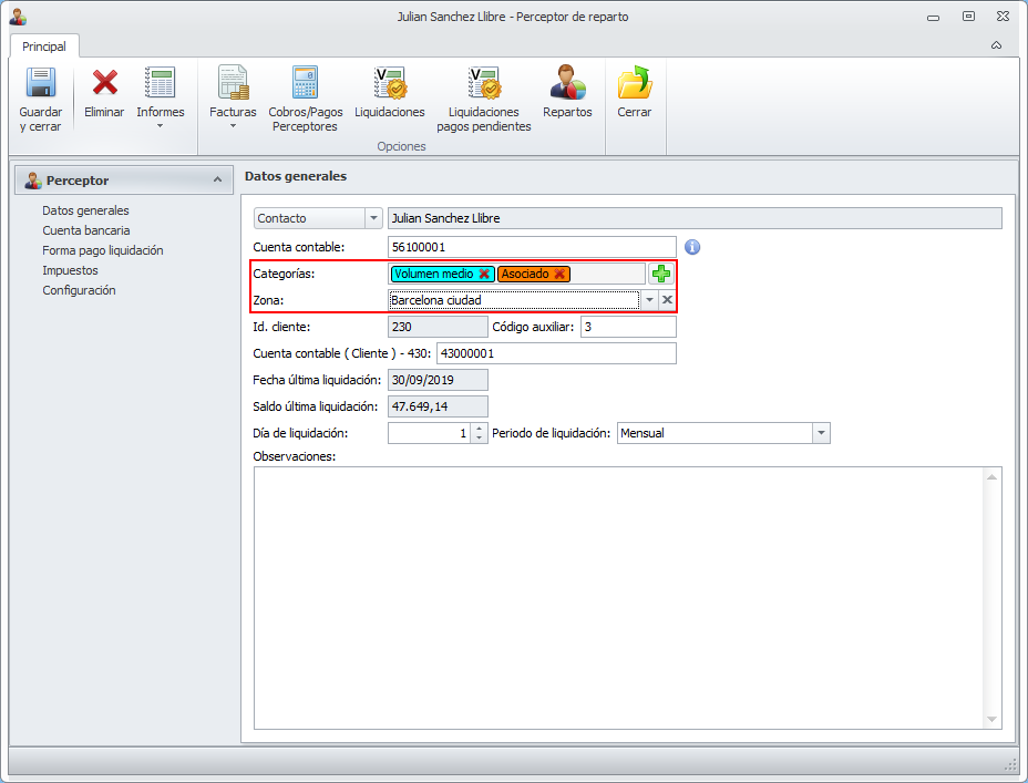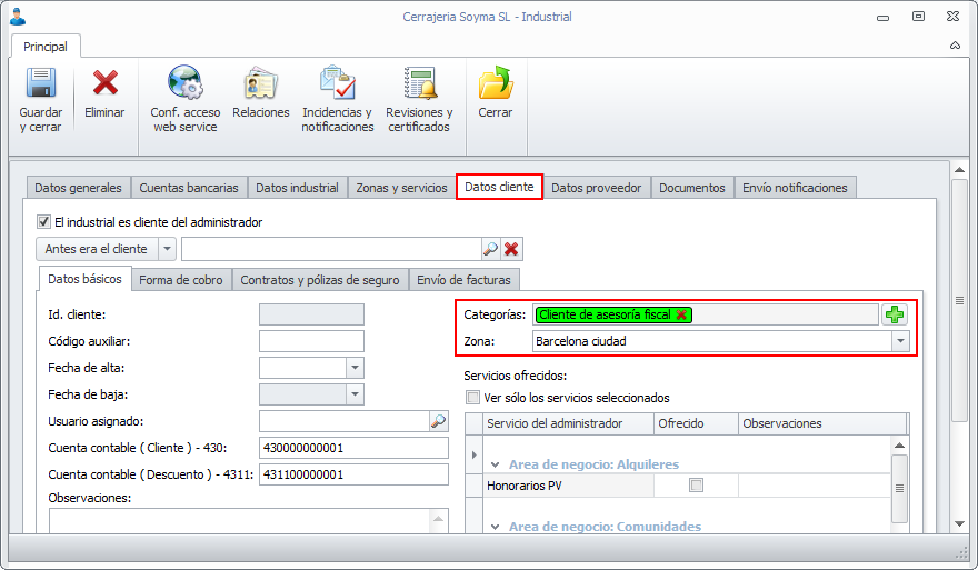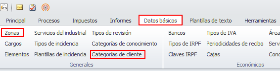 En todas las fichas de cliente (contacto, comunidad, macrocomunidad, industrial, arrendador y perceptor de reparto) dispone de casillas para indicar la zona del cliente y las categorías con que se le desee identificar. En la casilla Zona sólo se puede indicar una zona. En cambio se le puede asignar tantas categorías como se desee.