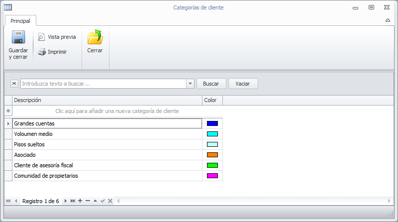 La ficha de cliente permite clasificarlo en una zona. También permite identificarlo con diferentes categorías. Estas categorías son configurables por parte del administrador y pueden hacer referencia a diferentes criterios de clasificación. Por ejemplo, pueden indicar: