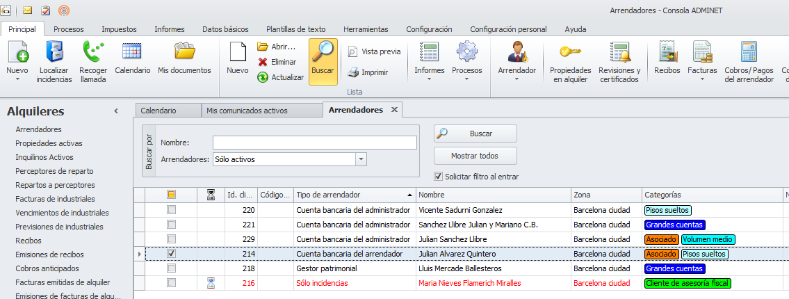 En las vistas de contactos, comunidades, macrocomunidades, industriales, arrendadores y perceptores de reparto se incluyen las columnas Zona y Categorías para que se pueda filtrar por su contenido.