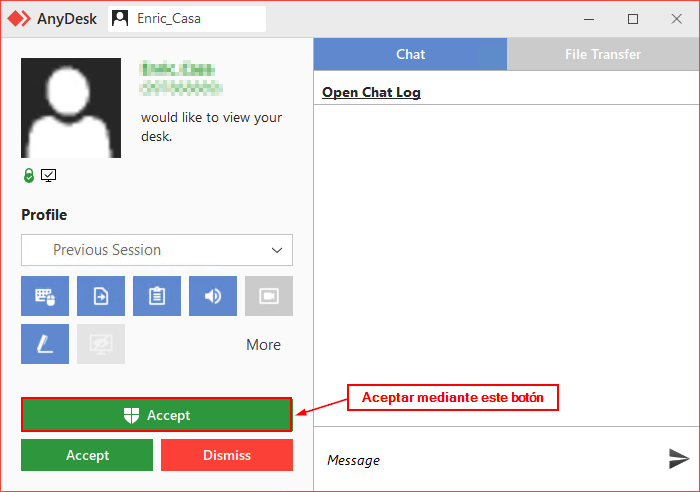 Cuando nuestro agente conecte con su equipo, se mostrará la siguiente ventana para que acepte la conexión. Debe hacerlo mediante el botón Accept que ve remarcado en la siguiente imagen.