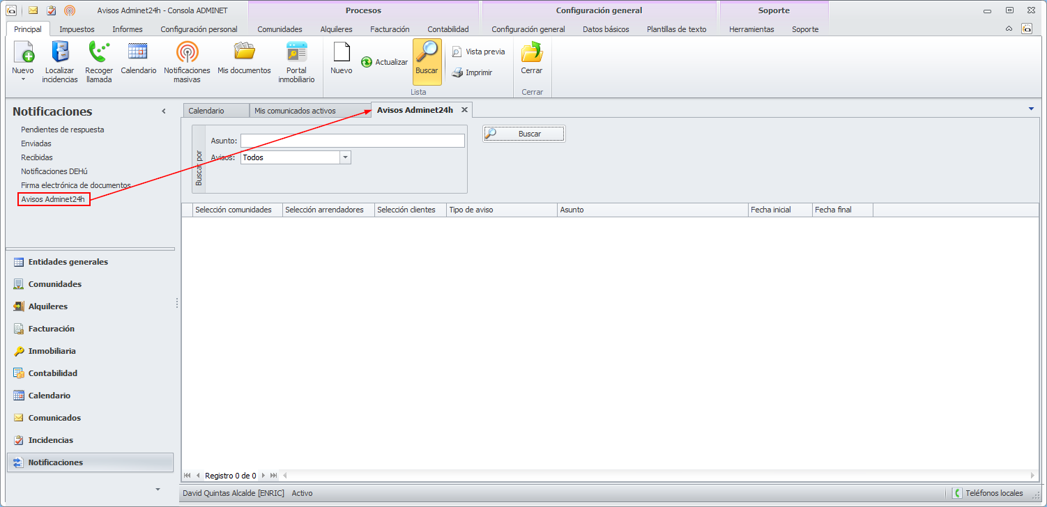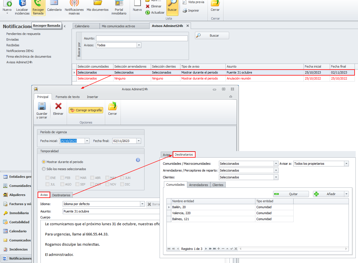 Los avisos adminet24h son comunicaciones que remite el administrador a sus destinatarios mediante avisos en la app ADMINET24H. Se pueden remitir avisos, simultáneamente, a propietarios de comunidades, y macrocomunidades, arrendadores, perceptores de reparto y clientes, que son las personas que pueden disponer de acceso a Adminet24h.