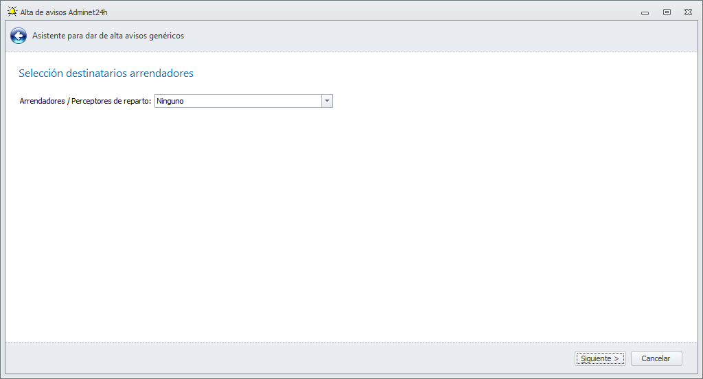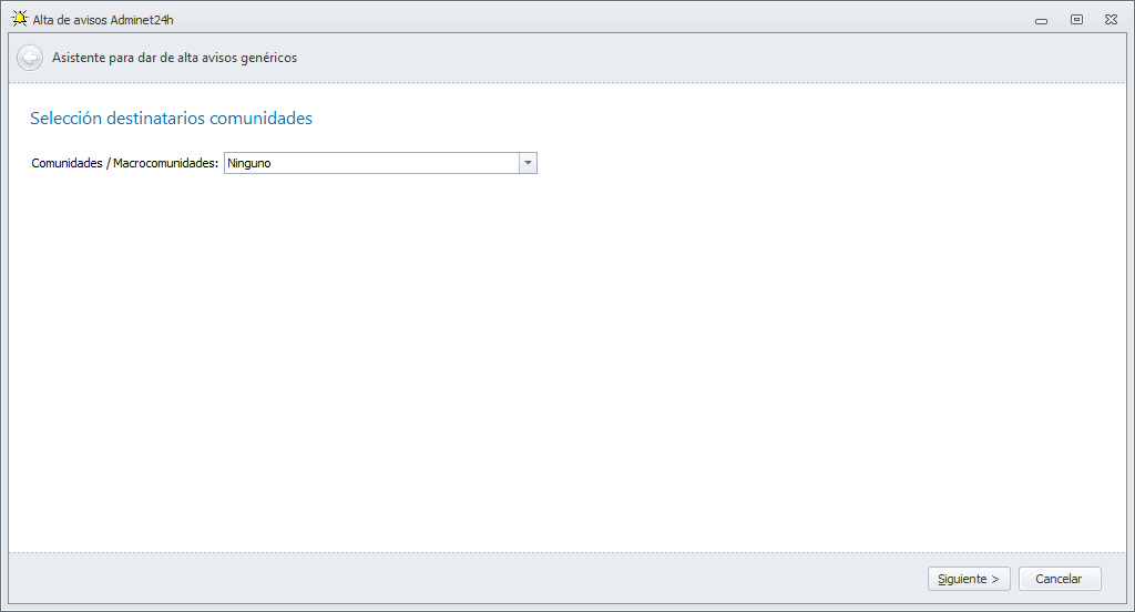 Al hacer clic en Nuevo, se abre el asistente de nuevo aviso. La primera ventana permite incluir como destinatarios a propietarios o presidentes de comunidades y macrocomunidades.