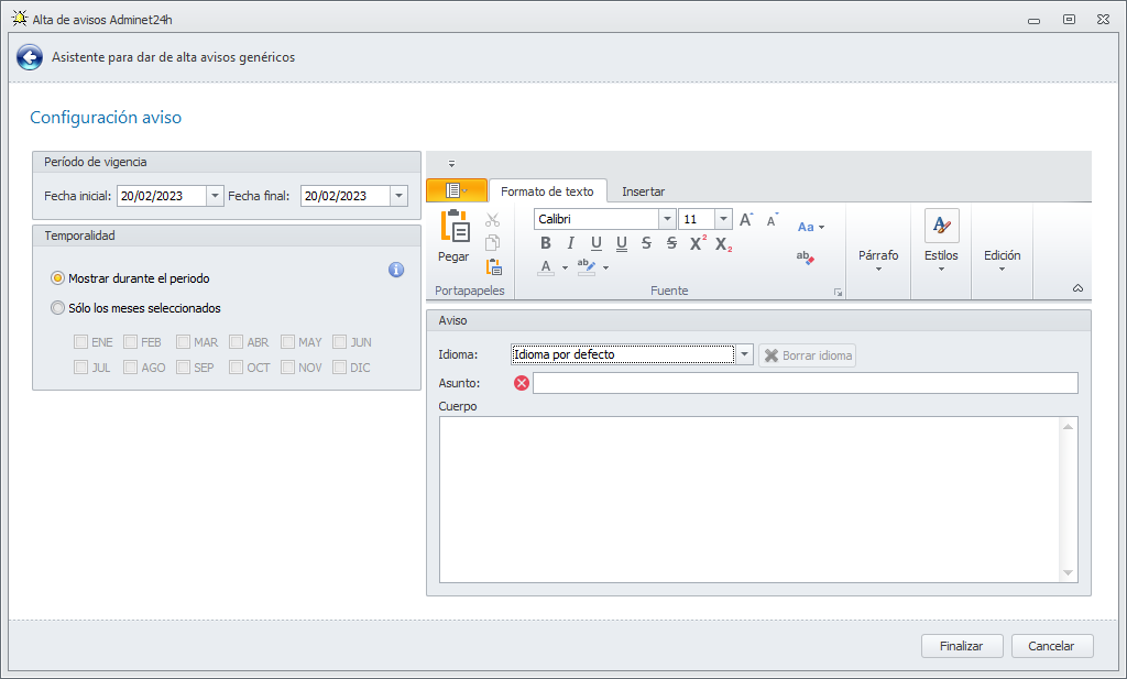 Cuerpo del aviso. Es el contenido del aviso que se remitirá. En la parte superior dispone de opciones de formato de texto e inserción.