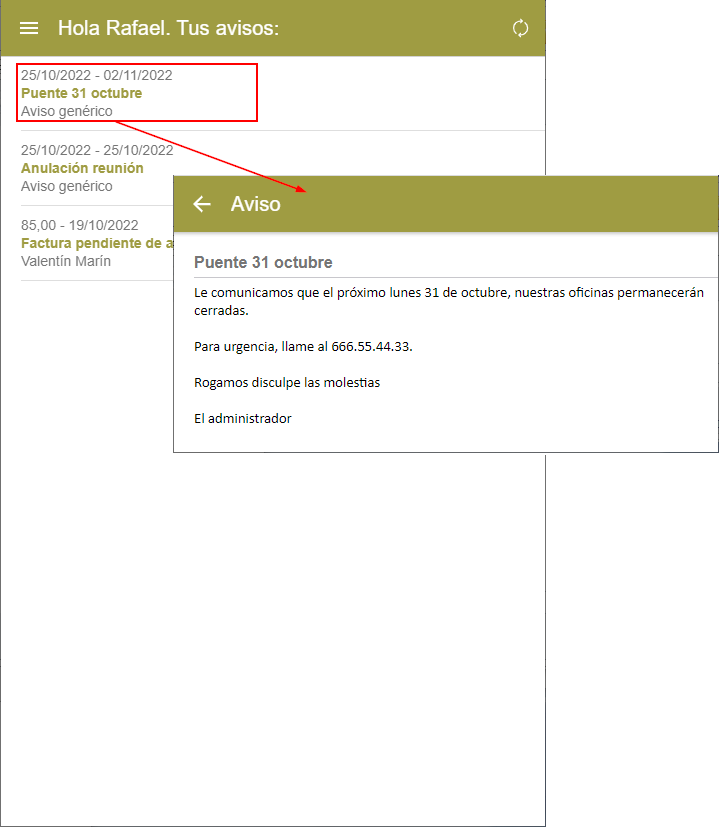 El destinatario del aviso, lo recibe en su ADMINET24H, como puede ver en el siguiente ejemplo.