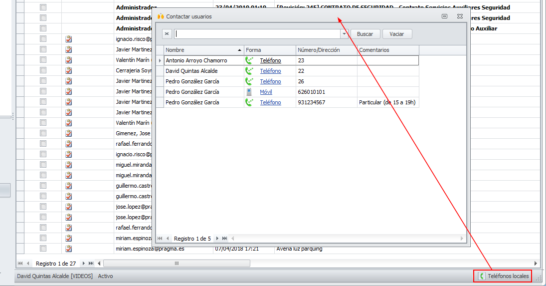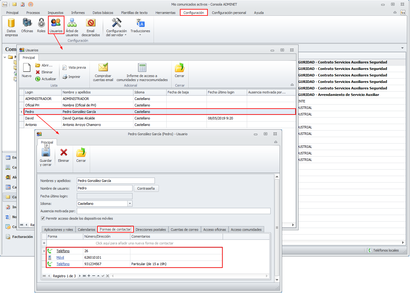 La identificación de los teléfonos de contacto de cada uno de los usuarios se efectúa en la pestaña Formas de contactar de su propia ficha.