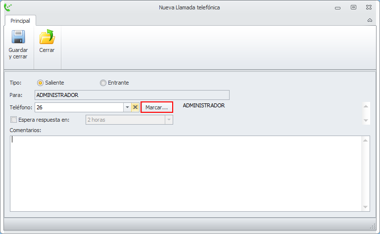 Si hace clic sobre uno de los teléfonos, se abre la ficha para registrar el resultado de la llamada. Si dispone de una centralita vozIP configurada en adminet puede realizar la marcación automática desde adminet.