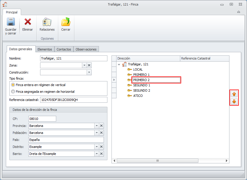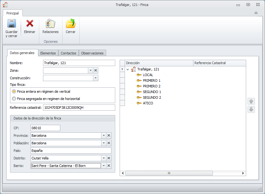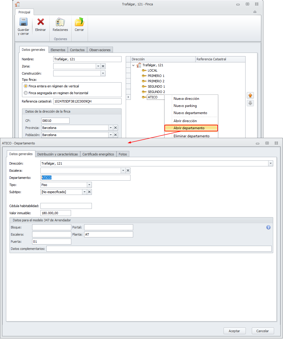 Las fincas y departamentos tienen una serie de datos propios, que son independientes de si se trata de una comunidad de propietarios o si es una finca de alquiler. De este modo se separan sus datos de los que corresponden al propietario de la comunidad, arrendador o inquilino.