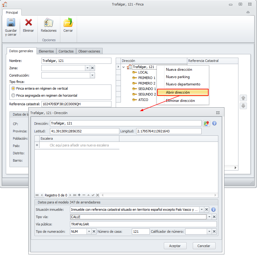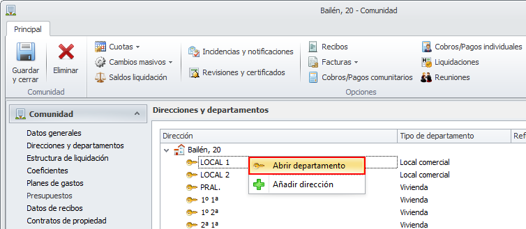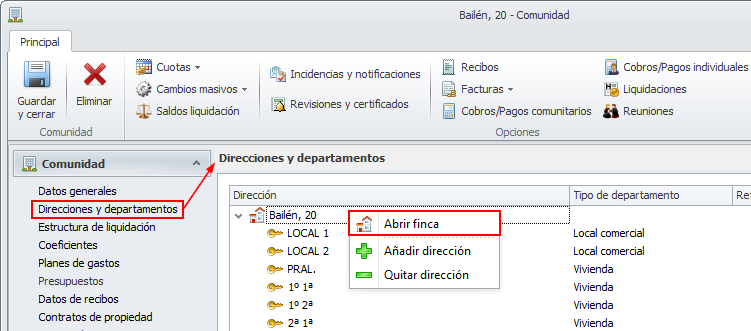Desde la sección Direcciones y departamentos de la ficha de la comunidad, haciendo clic derecho sobre la dirección, tiene la opción de Abrir finca.