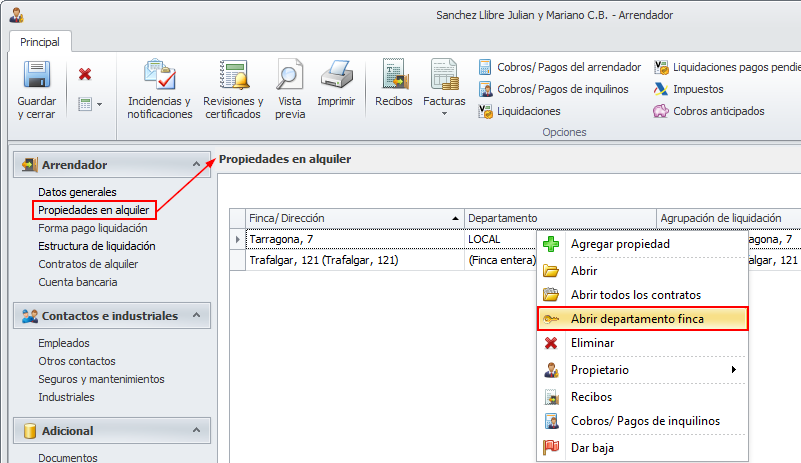 Desde la sección Propiedades en alquiler de la ficha del arrendador, haciendo clic derecho sobre una propiedad, tiene la opción de Abrir departamento finca.