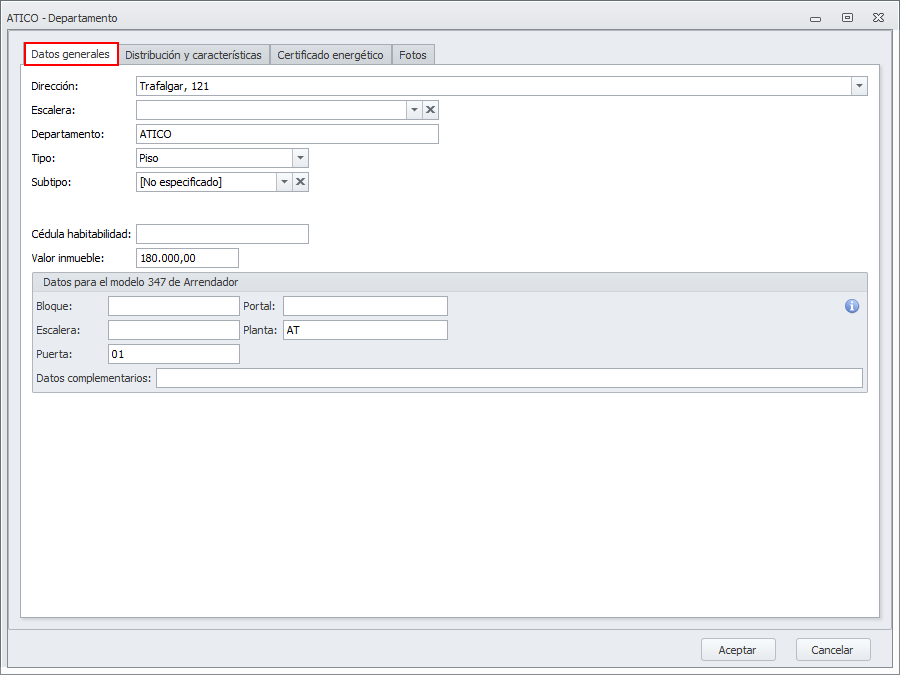 La pestaña Datos generales contiene datos diversos relacionados con la dirección. Si se trata de un inmueble cuyo alquiler se gestiona desde adminet, al acceder desde la ficha del arrendador, en la parte inferior se muestran los datos relacionados con el modelo 347.