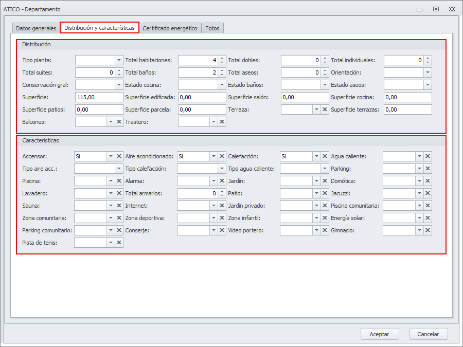 os datos que se solicitan en el apartado de Distribución y características se adapta al tipo de departamento escogido.