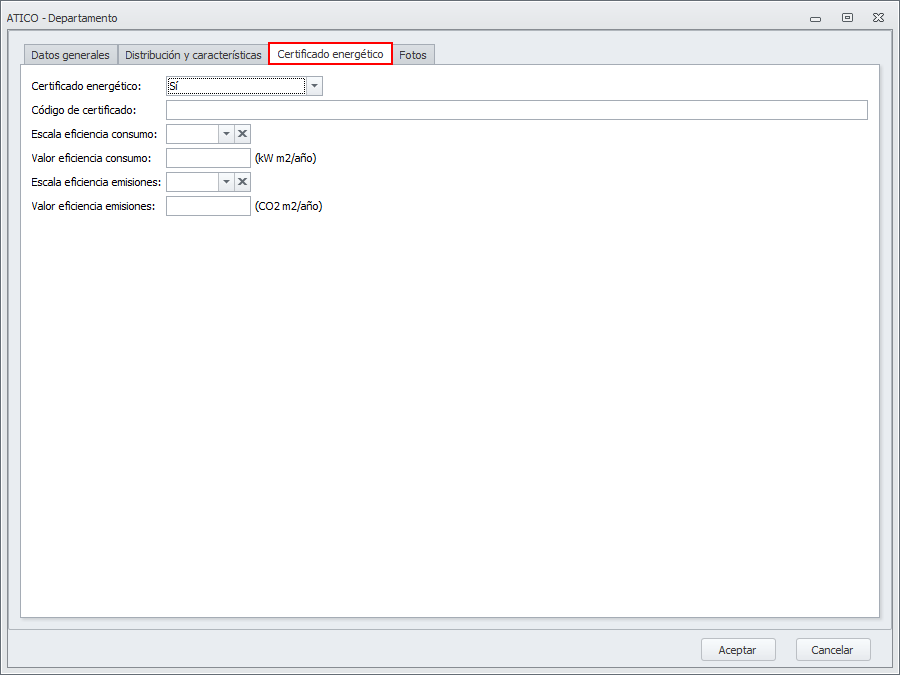 En pestaña Certificado energético pueden indicarse los datos referentes al certificado energético, en caso de disponer de él.