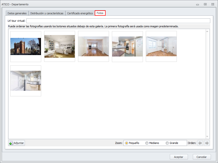 En Fotos, se pueden añadir las fotografías correspondientes a este inmueble, además de la URL correspondiente al tour virtual en caso de disponerse de él.