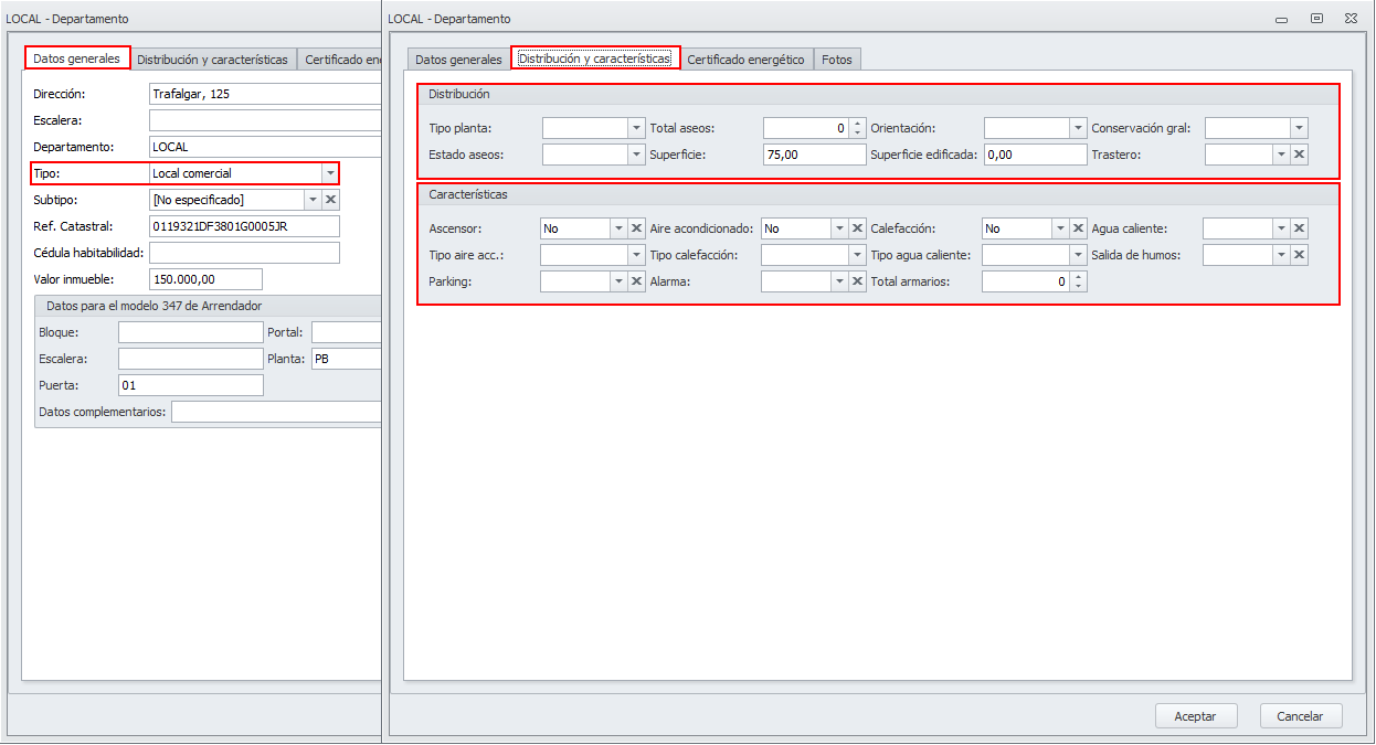 Las pestañas Distribución y características, Certificado energético y Fotos son empleadas por el módulo de Inmobiliaria.