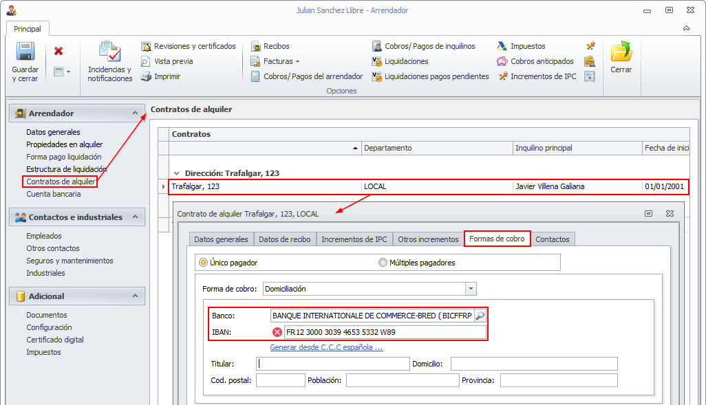 En el siguiente ejemplo, se añade como cuenta de cobro en un contrato de alquiler.