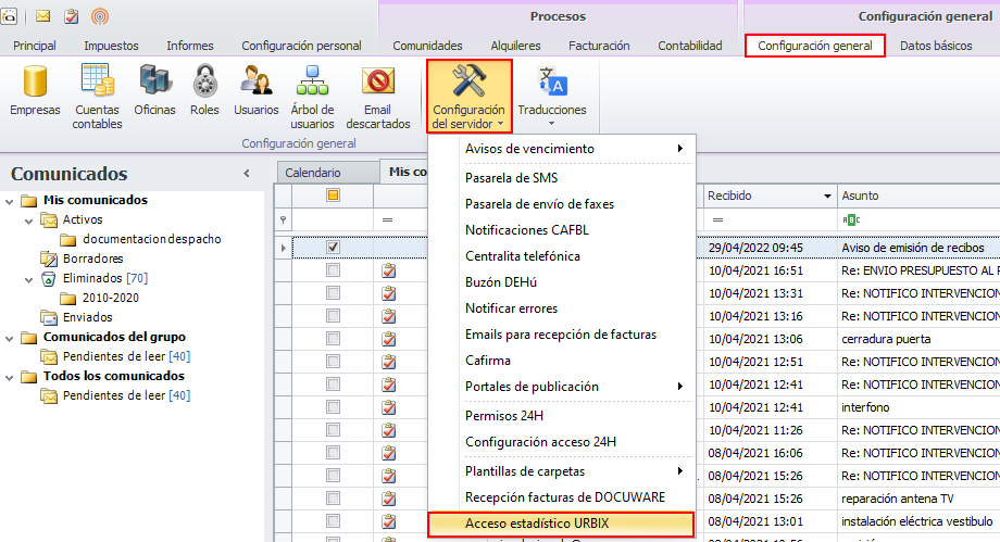 Para acceder a la configuración del acceso para Urbix vaya al menú Configuración general, haga clic en el botón Configuración del servidor y escoja Acceso estadístico Urbix.