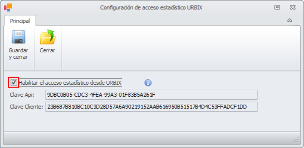 Se abre la ventana de configuración. Active la casilla Habilitar el acceso estadístico desde Urbix.