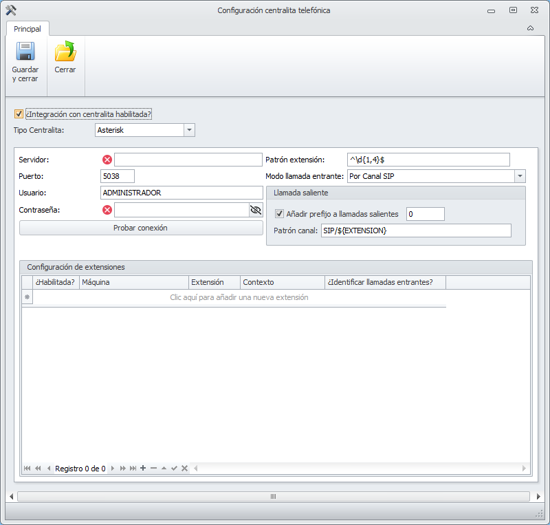 La ventana de configuración de la centralita, cuando se escoge Asterisk es la siguiente: