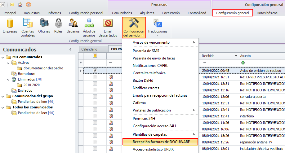 Para acceder a la configuración de la recepción de facturas desde Docuware vaya al menú Configuración general, haga clic en el botón Configuración del servidor y escoja Recepción facturas de DOCUWARE.