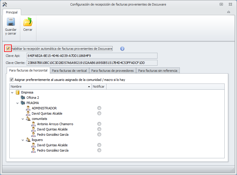 Para facturas de horizontal. Escoja el usuario que se asignará a la factura recibida de Docuware a través del webservice. Si escoge Asignar preferentemente al usuario asignado de la comunidad / macro si lo hay, se le asignará al usuario informado en la comunidad o macrocomunidad destinataria de la factura.
