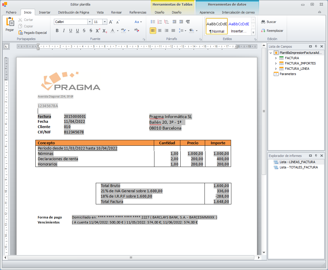 Al acceder a una plantilla de texto, ésta se muestra con un ejemplo de datos combinados y resaltados en gris, para facilitar su interpretación.