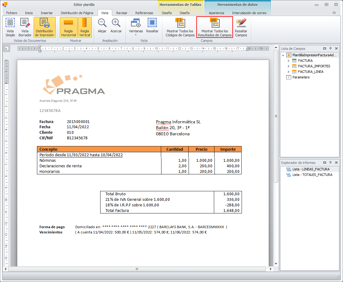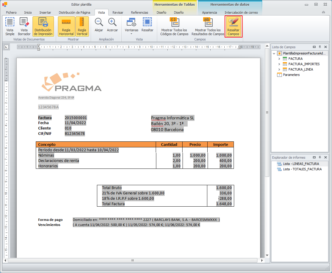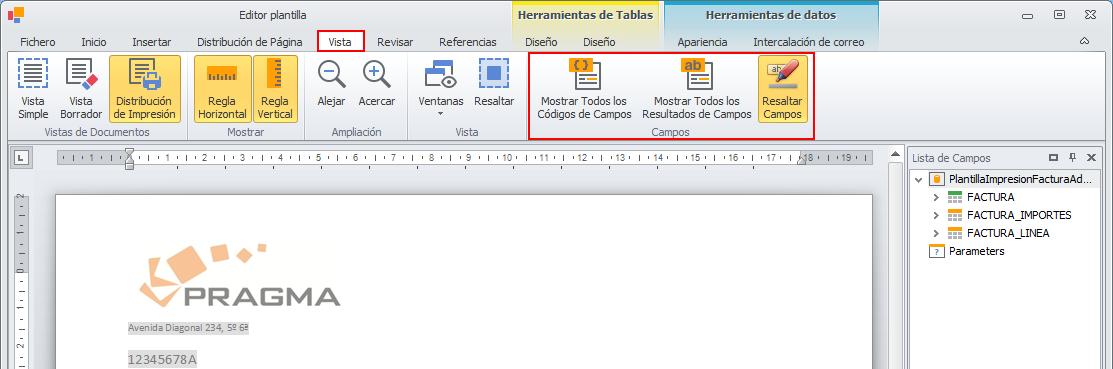 El menú Vista, permite, entre otras cosas, alternar los campos combinados con sus datos de ejemplo y mostrarlos resaltados opcionalmente. Esto se consigue con los botones situados en el apartado Campos.