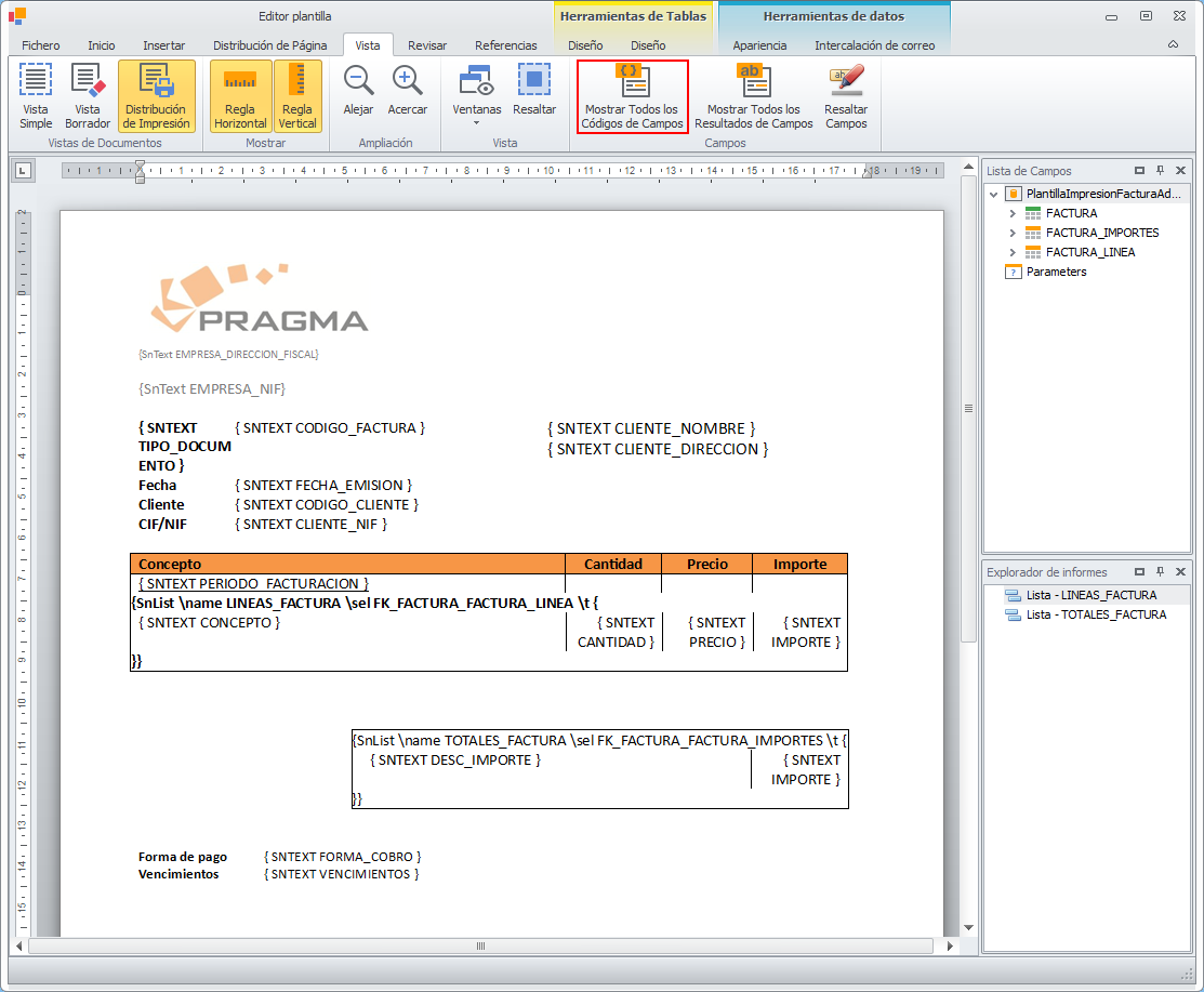 Mostrar Todos los Códigos de Campos. Muestra los nombres de los campos combinados, dentro de la plantilla.