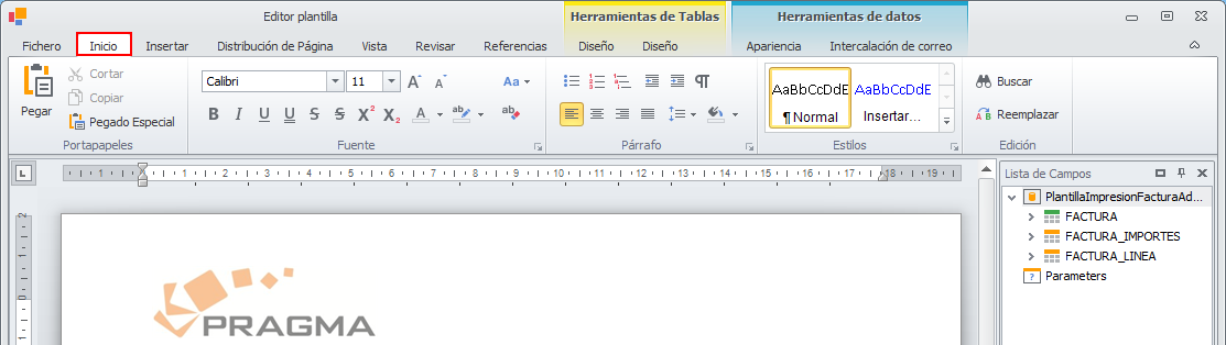 Al abrirse la plantilla el editor se posiciona en el menú Inicio.