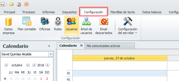 Cuando un usuario es baja en adminet debe informarse en su cuenta de usuario. Para ello se debe acceder al menú de Configuración y desde allí hacer clic en Usuarios.