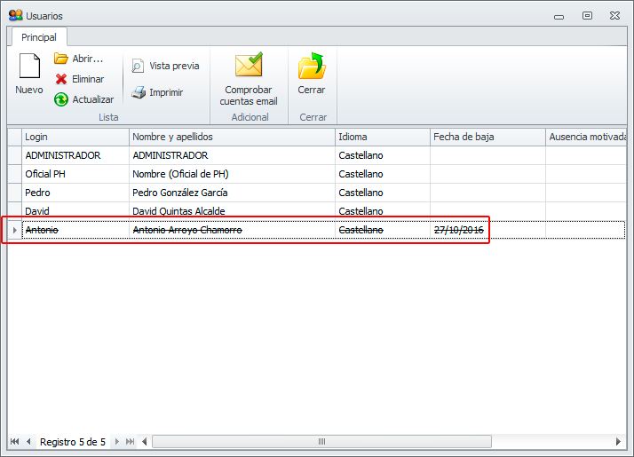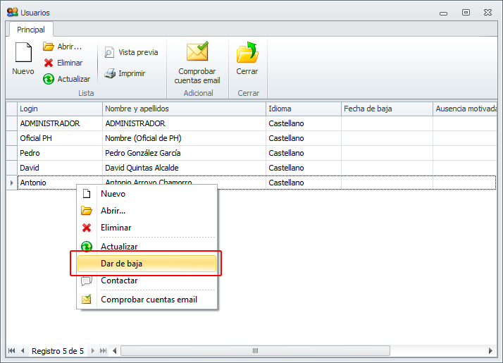 Seleccionar con el botón derecho el usuario que causa baja y hacer clic en la opción Dar de baja.